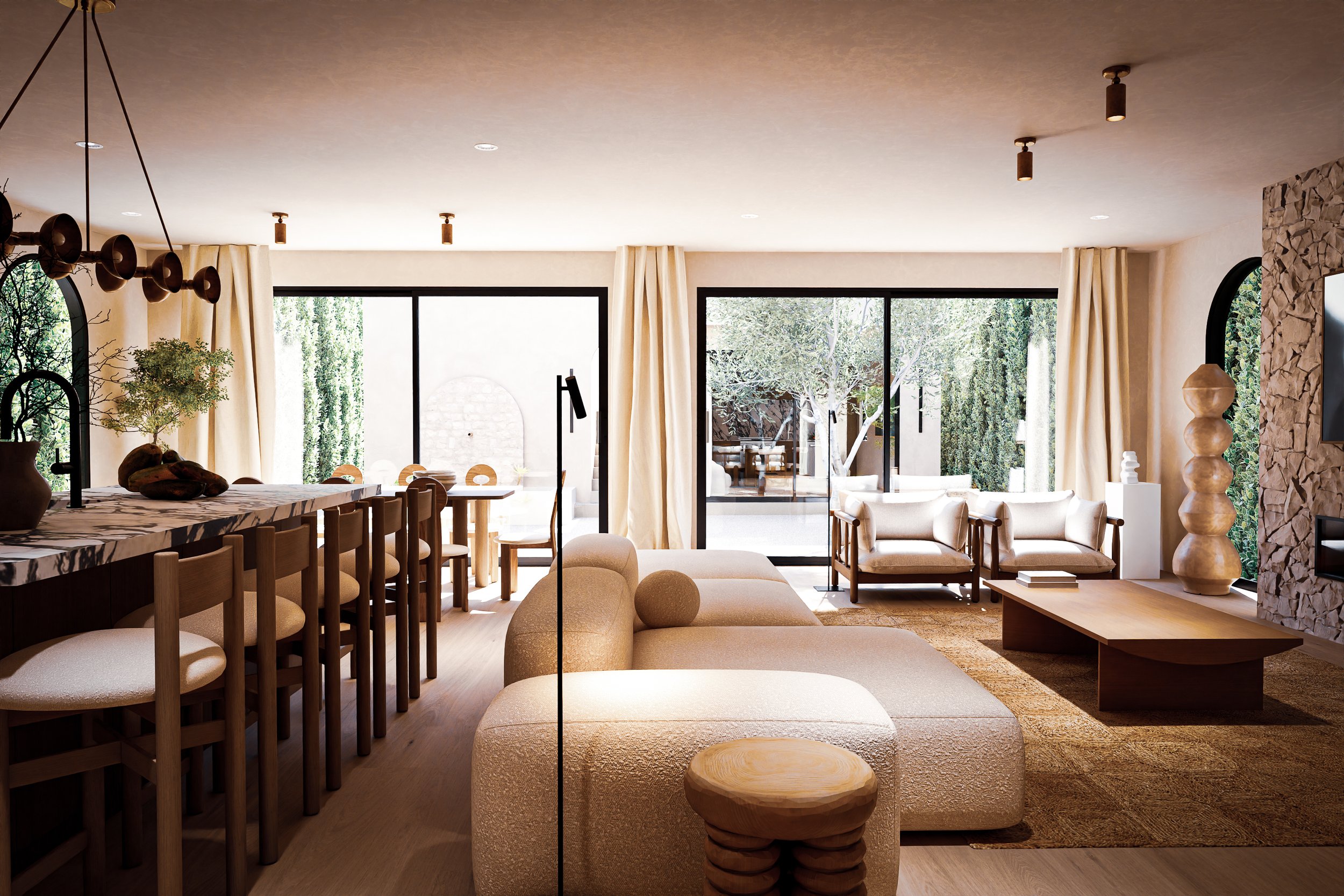In the wet areas, microcement finishes bring a seamless, sculptural quality, contrasting with bold marble accents. The kitchen is a central gathering point, with a fluted island base, veined stone surfaces, and custom lighting. Bathrooms are spa-like, balancing minimalism with natural luxury.